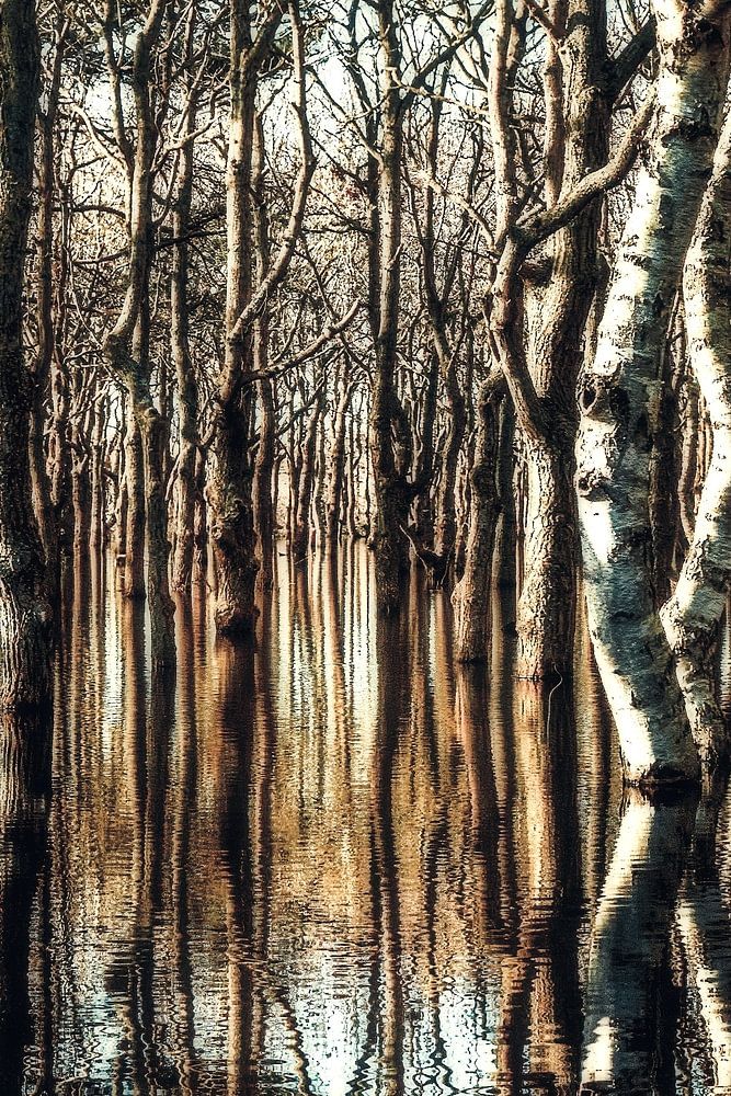 Die Reflexion der Bäume spiegelt die Bäume im Wasser. Im stillen Wasser wiederholt sich die Welt. Die Bäume beugen sich nach unten und suchen nach ihrem Spiegelbild, als wollten sie wissen, wer sie sind. Die Grenze zwischen Himmel und Wasser verschwimmt - was real ist und was sich nur spiegelt, scheint unwichtig. Jedes Plätschern erzählt eine Geschichte von Bewegung, von Atem, von Zeit, die für einen Moment stillsteht.