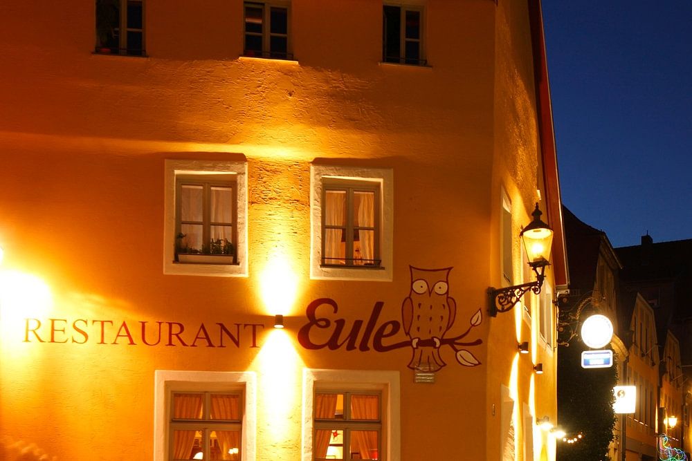 Altstadtgasse mit Gasthaus Eule bei Abenddämmerung, Oberfranken, Franken, Bayern, Deutschland, Europa