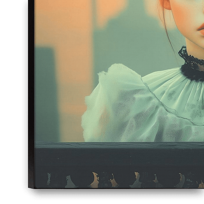 Das Porträt strahlt eine magische Mischung aus historischen und zeitgenössischen Einflüssen aus. Die ausdrucksstarken Augen und die detaillierte Farbgebung verleihen ihm einen verträumten, fast surrealen Charakter mit Vintage-Anklängen.