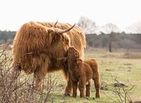 Bestelle dieses Schottische Hochlandrind Wandbild Bedingungslose Liebe mit Mama von Ans Bastiaanssen als Reproduktion auf Leinwand, Alu-Dibond, als Poster, Fototapete oder Acrylglasbild.