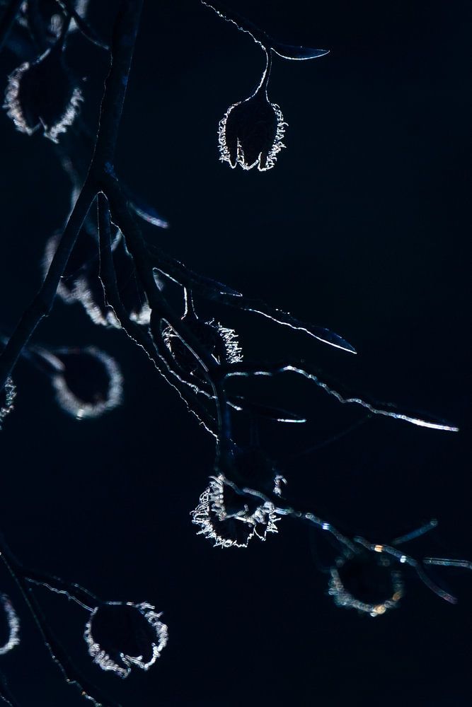 Ein Buchensaft wird auch als Buchenkissen bezeichnet. Wir kennen diese Frucht vor allem von der Bucheckern, die von dieser Schale umgeben ist. Ein Zweig voller Bucheckern, der im Gegenlicht unterbelichtet fotografiert wurde, ergab dieses Bild.