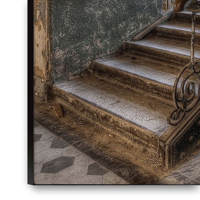 Bestelle das Foto Beelitz Heilstätten Treppe verlassene Orte Lost Places von Carina Buchspies als Reproduktion auf Leinwand, Alu-Dibond, als Poster, Fototapete oder Acrylglasbild.