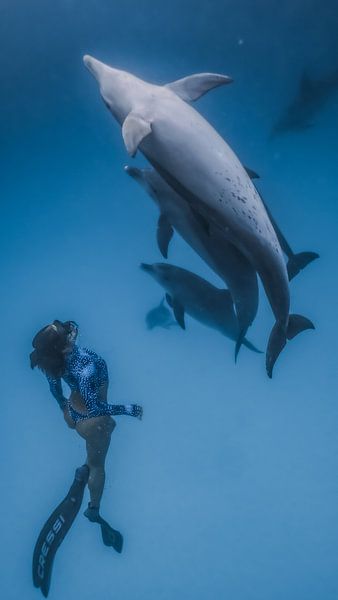 Eine Freediverin schwebt ruhig im offenen Blau, während sich über ihr eine Gruppe Delfine nähert. Der Moment wirkt fast zeitlos – eine stille Begegnung zwischen Mensch und Tier, geprägt von Neugier, Vertrauen und Respekt.
