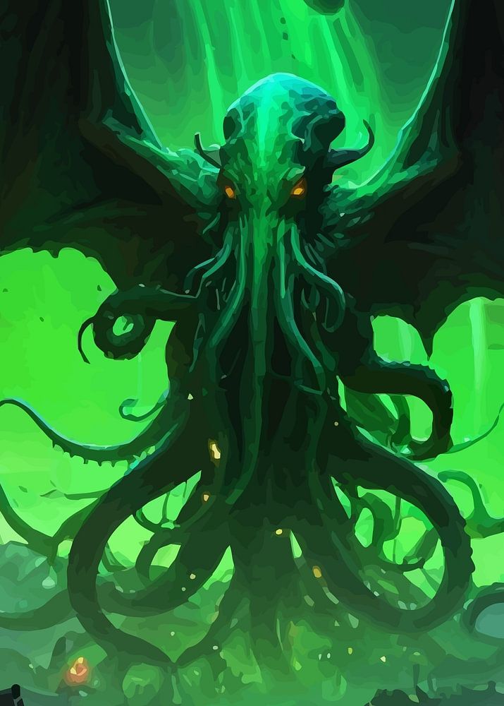 Ein einsamer Mann steht an einem trostlosen Ufer, während der Ozean aufgewühlt wird. Aus der Tiefe taucht Cthulhu auf - seine kolossale Gestalt verdeckt den Himmel, seine Tentakel winden sich. Gelähmt vor Angst starrt der Mann nach oben, überwältigt von der uralten, jenseitigen Präsenz, die seinen Verstand bedroht.