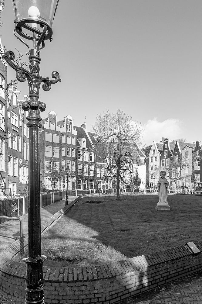 Die Sonne wirft lange Schatten auf den Begijnhof im Herzen von Amsterdam.