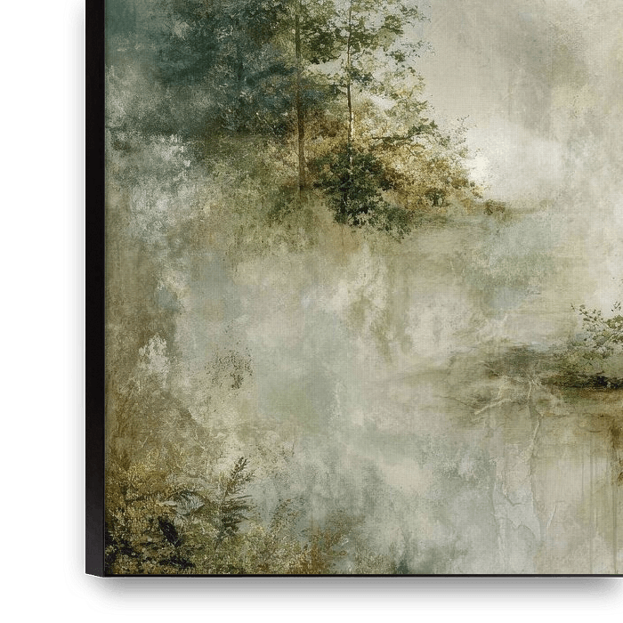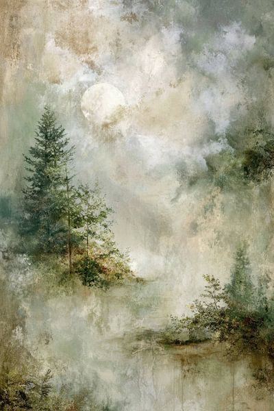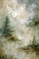Eine ausdrucksstarke abstrakte Waldlandschaft in Beige, Grün, Braun und Grau strahlt einen Hauch von Geheimnis aus. Eine zeitlose Szene mit nebligem Wald, die die Fantasie anregt und dem Raum eine vielschichtige, verträumte Energie verleiht.