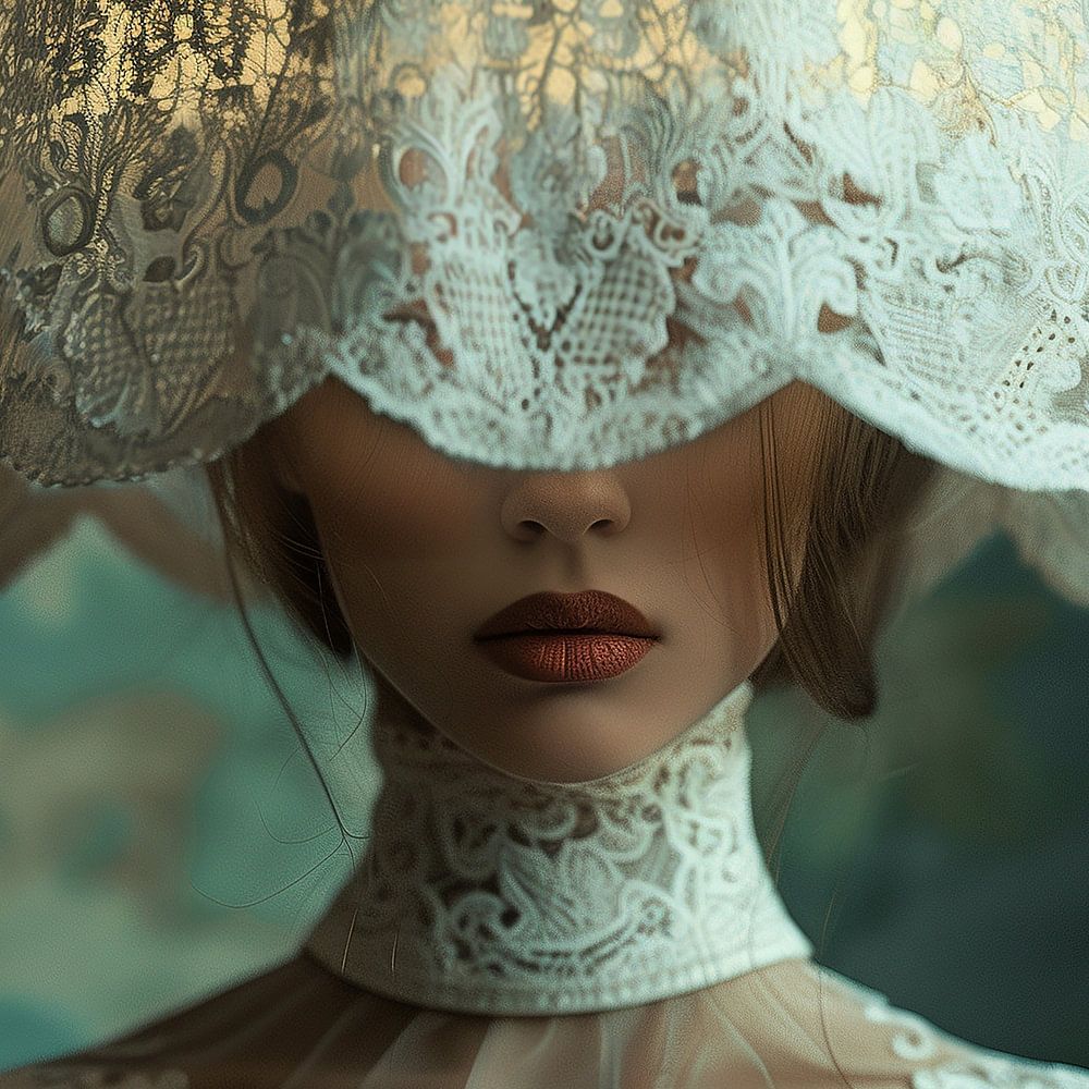 Bild einer eleganten Frau mit einer Lampe auf dem Kopf, die schön durch die Spitze des Lampenschirms scheint. Die gleiche schöne Spitze findet sich auch an ihrem Kleid und dem Band um ihren Hals. Stilvoll ausgeführt in Weiß, Elfenbein, Gold und Hellblau. Passend zu verschiedenen Stilen und Trends, darunter Modern Abstract, Imagination. Künstlerin: Bianca ter Riet