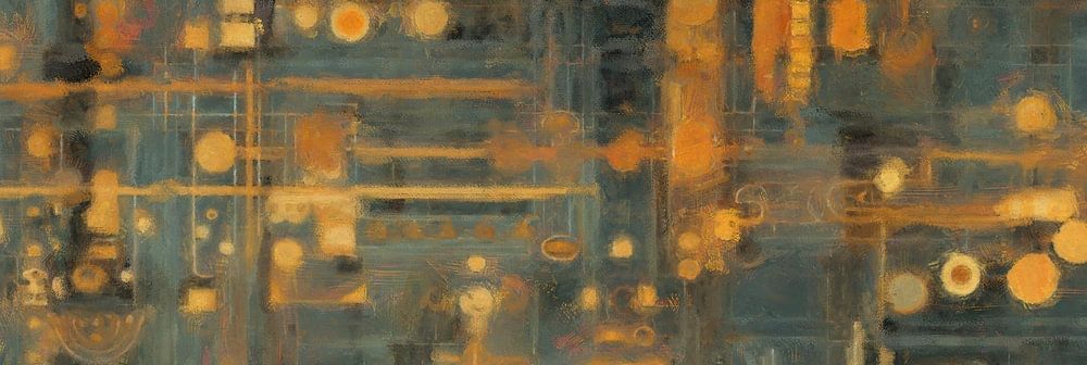 Illuminated Networks ist ein Werk, in dem Technologie und Kunst nahtlos ineinander übergehen. Das Werk zeigt ein komplexes Netzwerk aus goldenen Linien und Punkten vor einem dunklen Hintergrund, das den visuellen Effekt einer beleuchteten Stadt bei Nacht erzeugt. Die Präzision und die Struktur der Linien verleihen dem Werk eine futuristische und industrielle Anmutung. Dieses Werk spricht Liebhaber von Science-Fiction und technologischen Innovationen an und passt perfekt in moderne Innenräume, wo es ein Gefühl von Geheimnis und fortschrittlicher Technologie vermittelt.