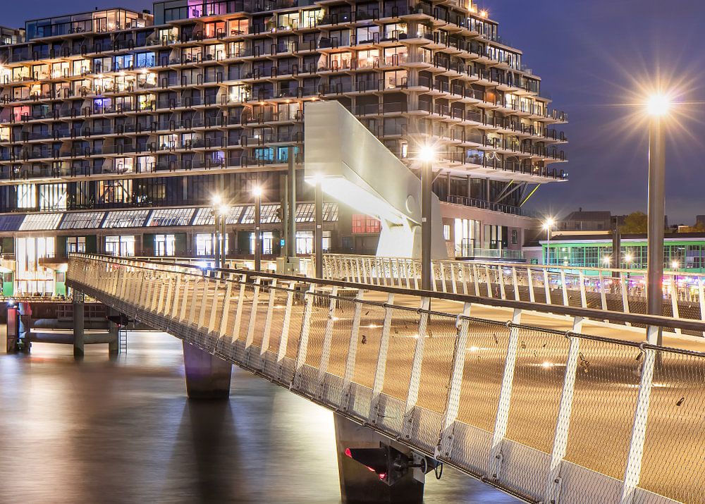 Beleuchtete Rijnhaven-Brücke in der Dämmerung mit Blick auf ein neues Wohnhaus in Katendrecht