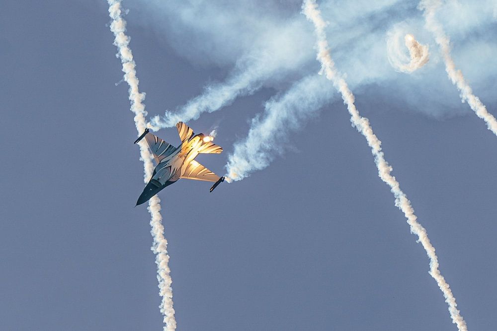 Belgische F-16 Demo "Dark Falcon" feuert Leuchtraketen ab Seit vielen Jahren hat die belgische Luftwaffe ein F-16 Vorführteam. Von 2018 bis 2021 flog sie eine speziell lackierte F-16 namens Dark Falcon, die vom Luftwaffenstützpunkt Florennes kam, mit Pilot Stefan "Vador" Darte. Dieses Bild wurde am 15. September 2019 während der Sanicole Airshow aufgenommen.