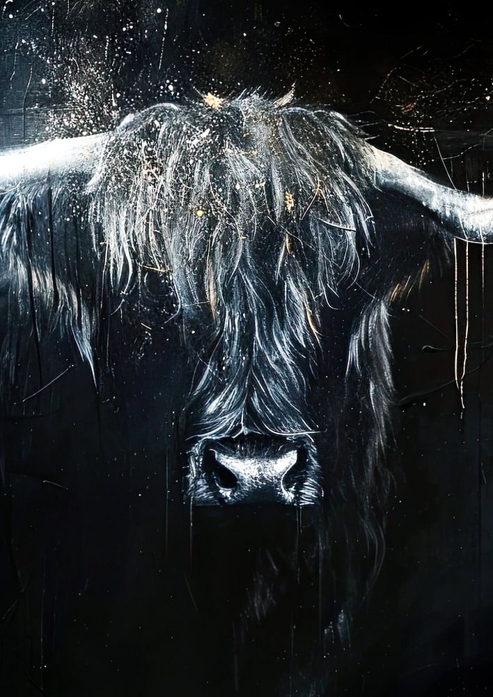 Details: Hochlandrind, Malerei, Tier, Kunst, schwarz, weiß, gold