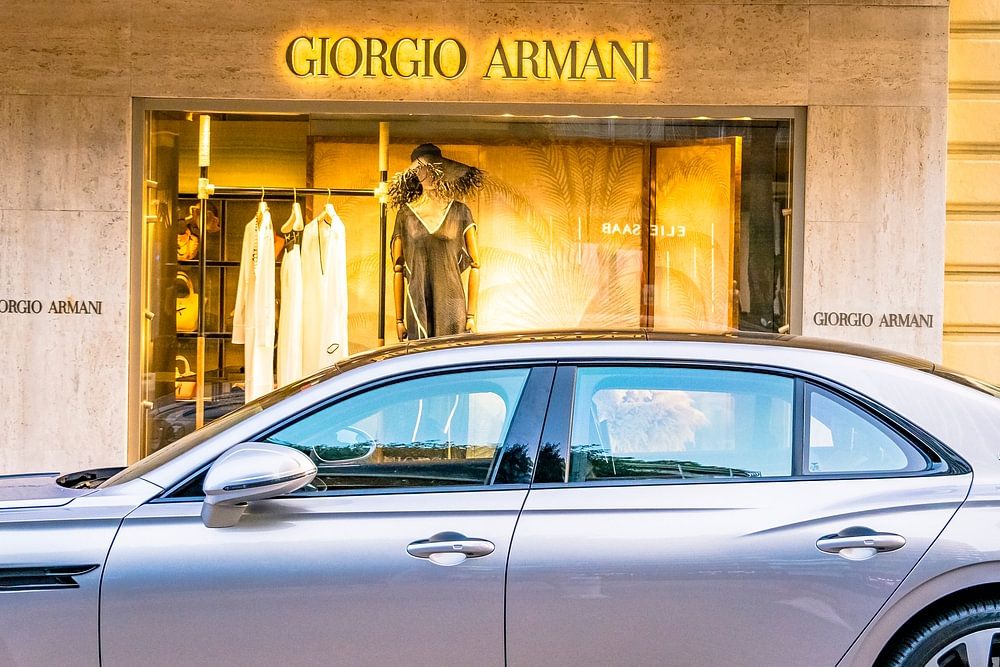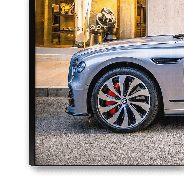Die Luxuslimousine Bentley Flying Spur parkt auf der Straße vor dem Geschäft von Giorgio Armani in Monte Carlo, Monaco, an der Côte d'Azur.
