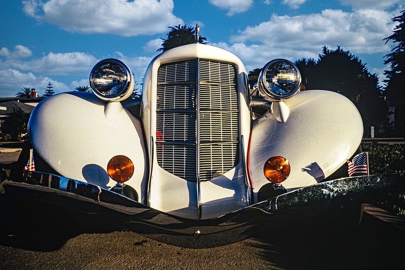 Foto Front Super-charged Oldtimer Kabriolett Bentley Motorhaube Kotflügel und Stossstange bei bewölktem Himmel