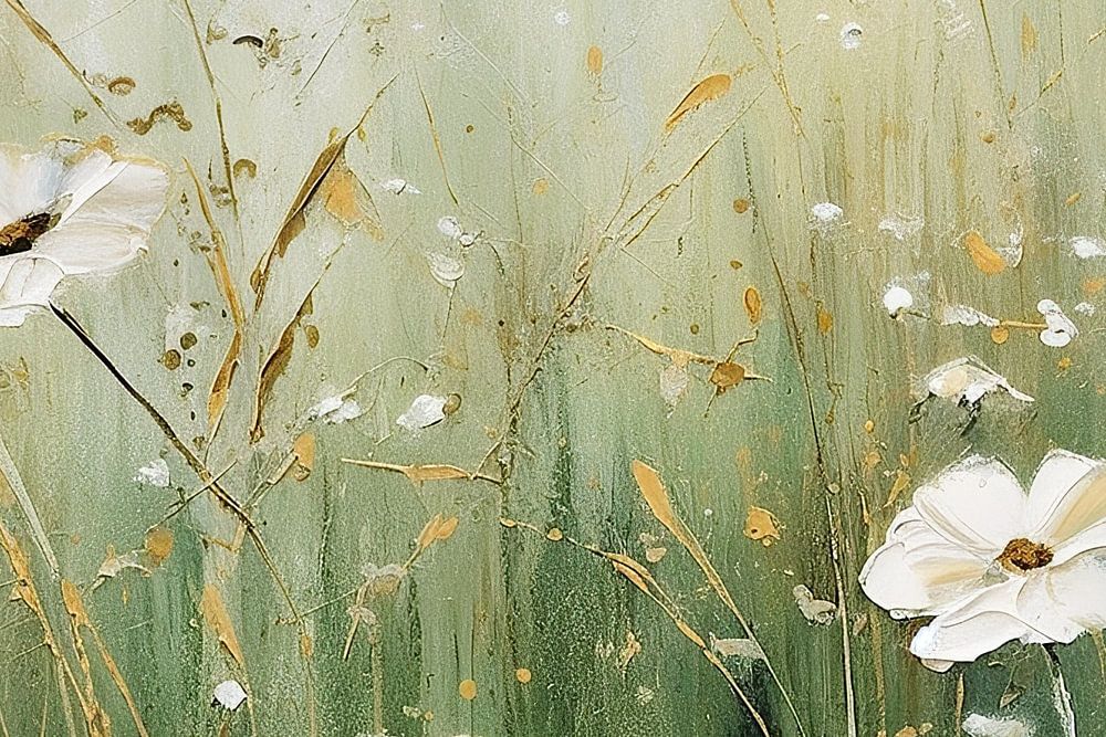 Grüntöne strahlen ein Gefühl von Ruhe und Natur aus. Dieses Gemälde wurde in diesem Sinne gemalt. Goldene Akzente verleihen dem Gemälde Glanz.