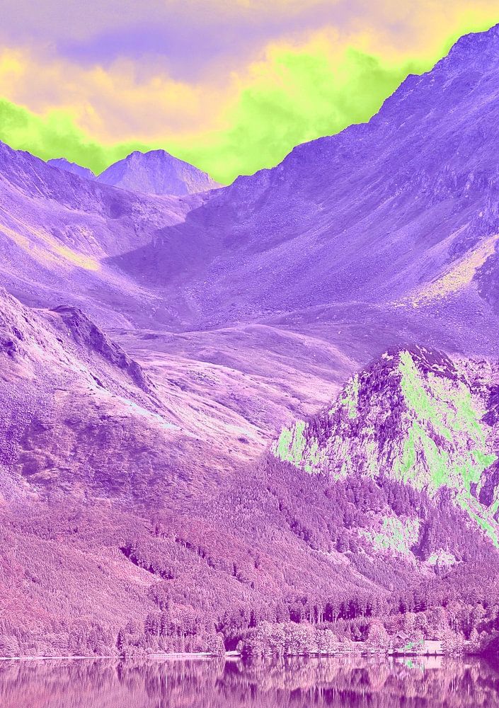 Wie aus einem Traum oder einer Meditation entstanden wirkt die Berglandschaft, die ganz in surrealen und modernen Farben gehalten ist.