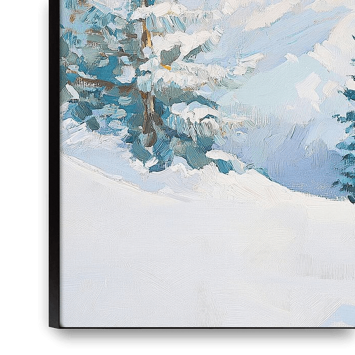 Ein impressionistisches Gemälde einer verschneiten Alpenlandschaft mit immergrünen Bäumen, gedämpften Farben, einem blauen Himmel, weißem Schnee und rosa Bergen im Hintergrund. Das Gemälde ist in einem Vintage-Ölfarbe Stil mit einer minimalistischen Ästhetik, was in einer schönen Szene.