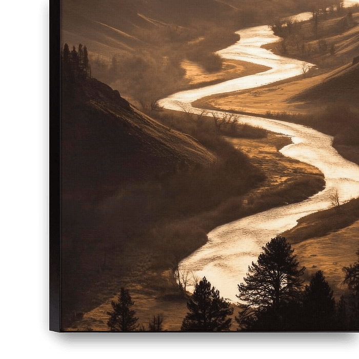 In goldenen Morgenstunden schmiegt sich ein sanfter Fluss durch eine mystische Landschaft, während die sanften Hügel in sanften Nebel gehüllt sind. Abgerundet von majestätischen Bergen, die sich im Hintergrund erheben, entfaltet sich eine harmonische Symphonie aus Licht und Schatten, die den Betrachter in eine friedvolle Traumwelt…