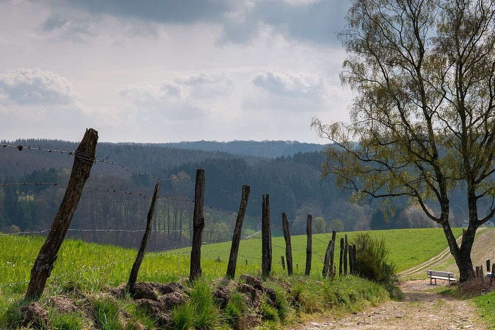 Panoramabild der Landschaft entlang des Bergischen Panoramasteigs zur Frühlingszeit, Bergisches Land, Deutschland