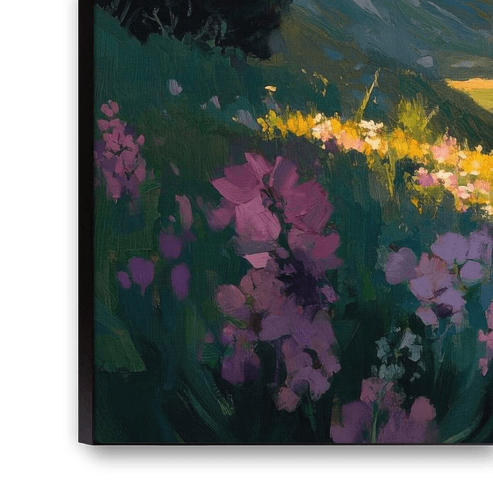 Ein harmonisches Zusammenspiel aus majestätischen Bergen und sanften Tälern, durchzogen von bunten Wildblumen, schafft eine friedliche Atmosphäre. Diese idyllische Landschaft strahlt Ruhe und Inspiration aus, ideal für das Wohnzimmer, wo sie einen natürlichen Akzent setzt und zum Träumen einlädt. Ein perfekter Rückzugsort in den eigenen vier Wänden.