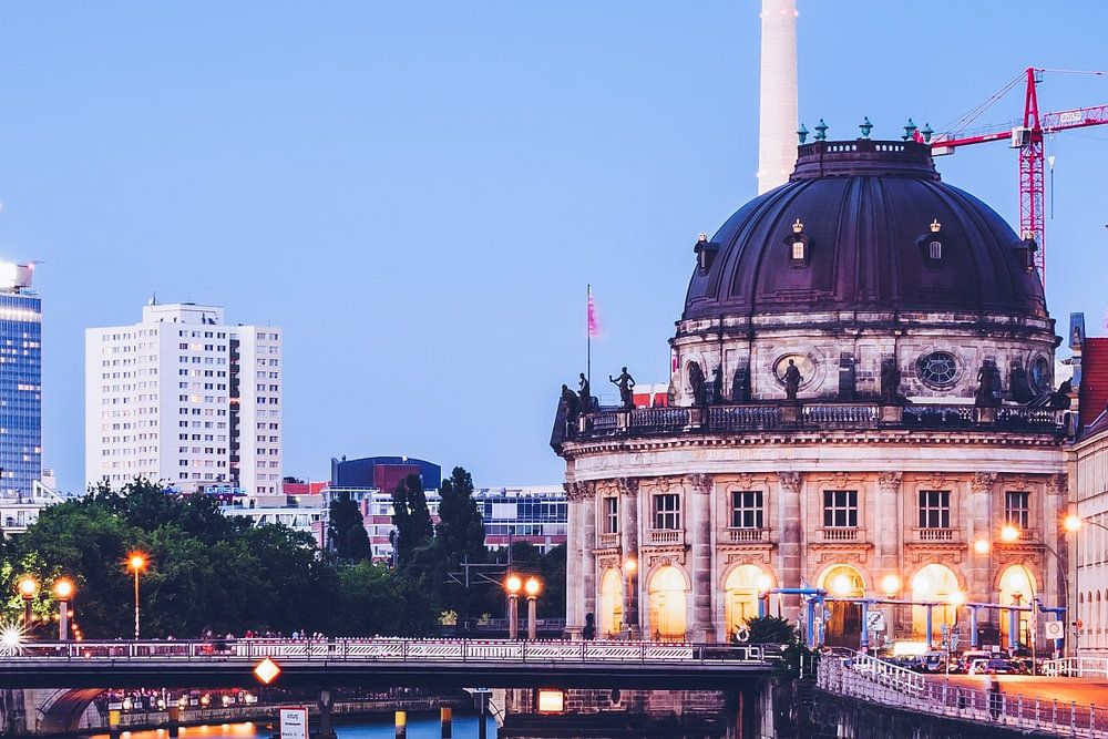Das Foto zeigt einen Blick von der Weidendammer Brücke über die Spree auf das Bode-Museum und den Fernsehturm.