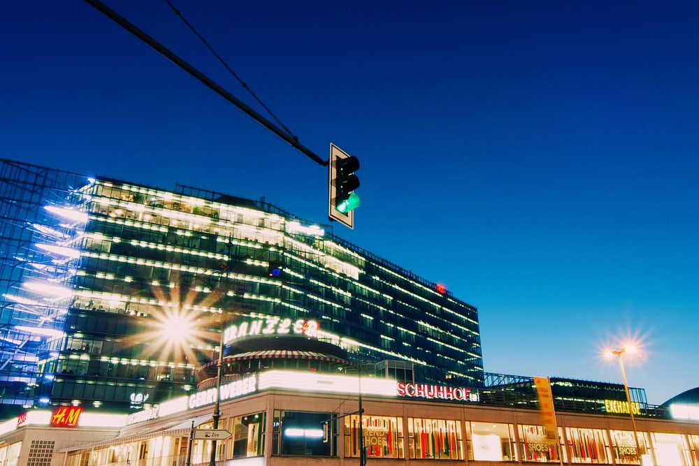 Berlin bei Nacht an der Kreuzung Kurfürstendamm / Joachimstaler Strasse: Ein Blick auf das ehemalige Cafe Kranzler, dahinter das Quartier Neues Kranzler Eck.