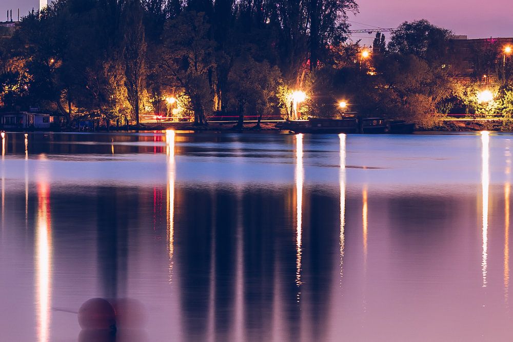 Die Langzeitbelichtung zeigt einen Blick über die Bucht auf den Wasserturm Ostkreuz und den Fernsehturm.