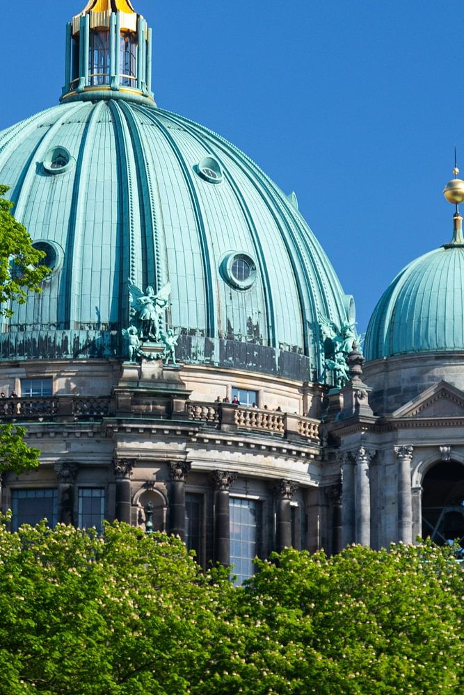 Der Berliner Dom, fotografiert vom Alten Museum aus. Ein schönes frisches und sommerliches Foto wegen der grünen Blätter an den Bäumen. Das Dach des Doms hebt sich schön gegen den blauen Himmel ab.