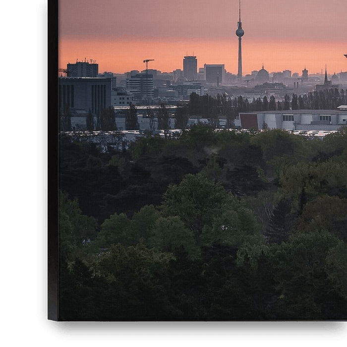 Bestelle das Foto Berliner Fernsehturm und Funkturm zum Sonnenaufgang von swc07 als Reproduktion auf Leinwand, Alu-Dibond, als Poster, Fototapete oder Acrylglasbild.