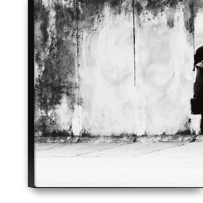 Eine junge Frau geht an der Berliner Mauer entlang. Straßenfotografie aus Berlin in schwarz und weiß.