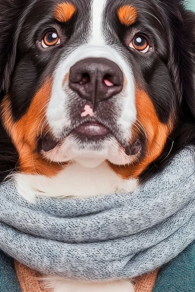 Mit seinem majestätischen, dreifarbigen Fell und den sanften, ausdrucksvollen Augen strahlt dieser Bernese Mountain Dog eine charmante Eleganz aus. Eingehüllt in einen weichen Schal und einen stilvollen Mantel, wirkt er fast wie ein modebewusster Begleiter, der bereit ist, die Welt zu erkunden und Herzen zu erobern. Ein Bild voller Leidenschaft und Wärme!