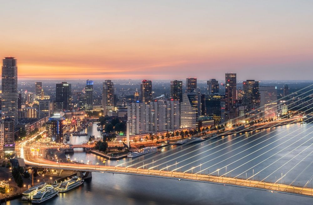 Lassen Sie sich von der heiteren Schönheit Rotterdams bei Sonnenuntergang mit diesem atemberaubenden Foto verzaubern. Die beruhigende Atmosphäre der Szene lädt zur Entspannung ein und spiegelt den unaufdringlichen Charme dieser modernen Metropole wider.