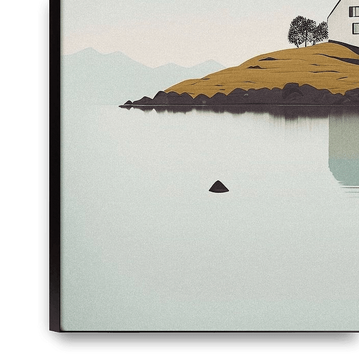 Tranquil landscape #08 - A print eine kleine Insel, umgeben von teilweise schneebedeckten, kargen Bergen in der Ferne. In der Mitte der Insel steht ein Haus. Dieser verlassene Ort in der Welt strahlt Ruhe und Einfachheit aus. Ein perfekter Ort, um sich von der Hektik des Alltags zurückzuziehen. Dieser Landschaftsdruck ist in…
