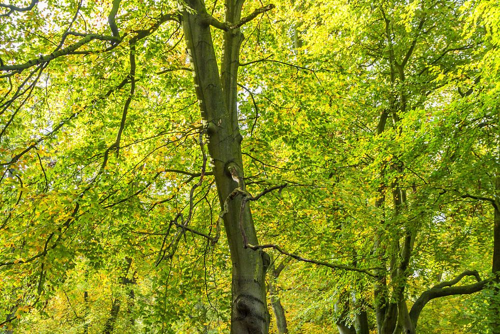 Bos met volwassen beukenbomen in herfstkleuren in een bos in het Nederlandse landgoed Groenendaal