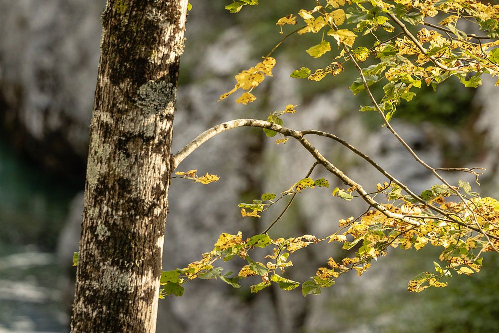 Bewaldete Schlucht entlang des Flusses Soča mit einer Brücke, einem Wasserfall und Wegen zum Wasser. Scharf sind die Äste mit dem Fluss im Hintergrund