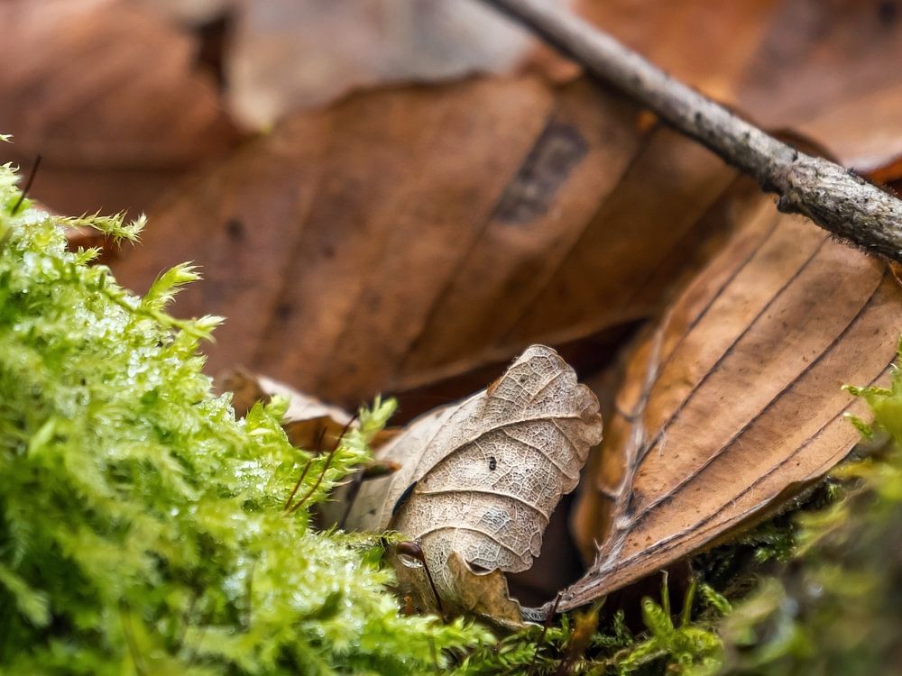 Ein Perspektivwechsel kann Wunder wirken, im eigentlichen wie im übertragenen Sinne. Hier unten auf Bodenhöhe tut sich noch einmal eine ganz andere, ganz neue Landschaft auf. Ein kleiner Miniaturwald bestimmt das Bild, er bildet ein Tal, welches das Laub der Bäume auffängt. So nah dran, sieht man wunderschöne Strukturen und andere Details.