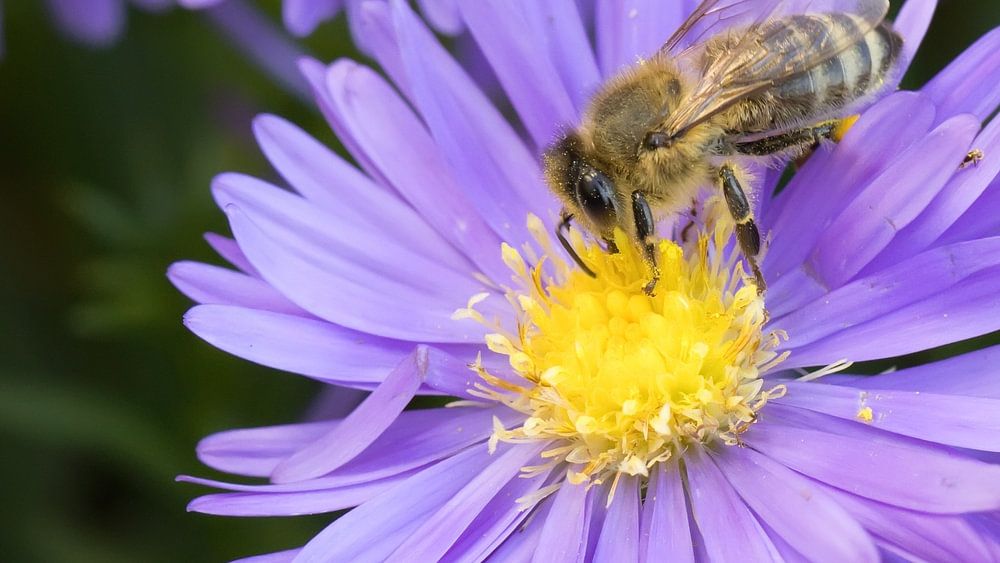 Biene auf violetten Astern im Herbst