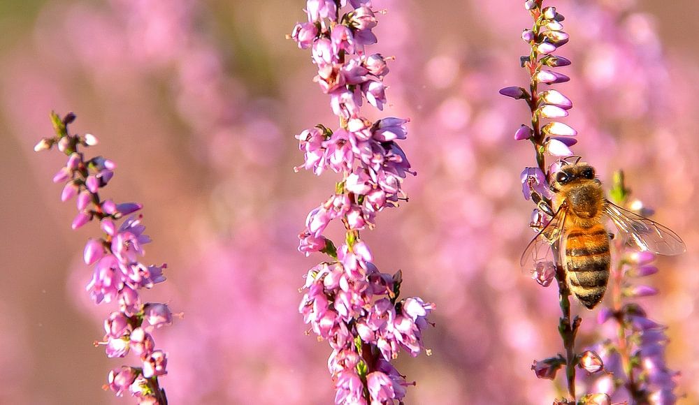 Eine Biene landet an einem schönen Frühlingstag auf einer Lavendelblüte.
