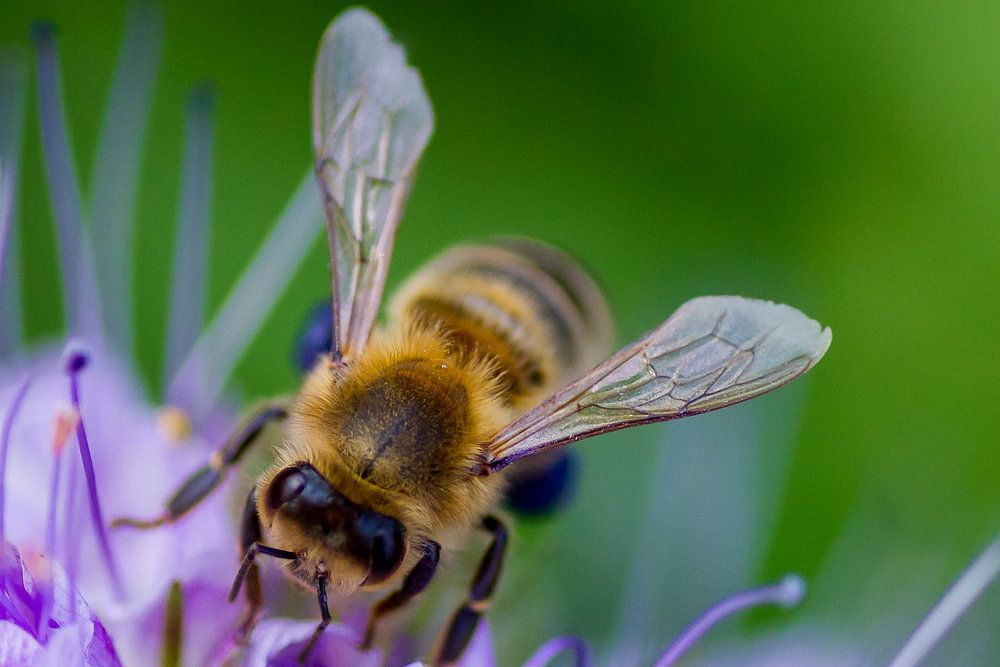 Die zerbrechliche Biene in einer schönen Nahaufnahme, wie sie gerade Nektar sammelt. Die lilafarbenen Blüten bilden einen schönen Farbkontrast zu dem frischen Grün in diesem Naturfoto. In diesem sommerlichen Naturfoto können Sie diese schöne Kreatur aus der Nähe bewundern.