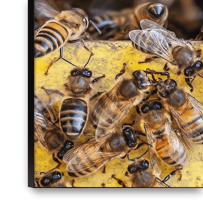 Sie können Bienen bei der Arbeit sehen. Es ist eine Nahaufnahme von Bienen, die in einen Bienenstock hinein- und herausfliegen, wo sie Honig machen.