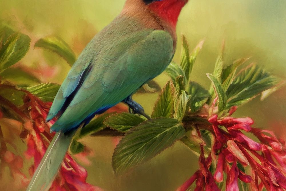 Ein rothaariger Bienenfresser auf einem Zweig mit roten und rosa Blüten, grünen Blättern und einem wunderschön gemalten Hintergrund in leuchtenden tropischen Farben.
