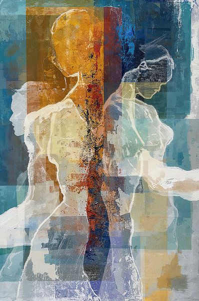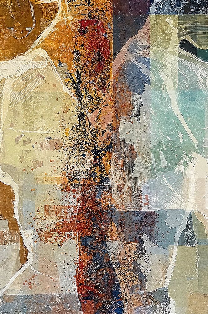 In Equilibrium verschmelzen transparente Figuren und geometrische Farbfelder zu einer harmonischen Komposition. Blau-, Ocker- und Cremetöne schaffen Ruhe, während subtile Kontraste das Werk lebendig halten. Der schichtweise Aufbau lädt zum längeren Betrachten ein - jede Schicht offenbart eine neue Nuance.