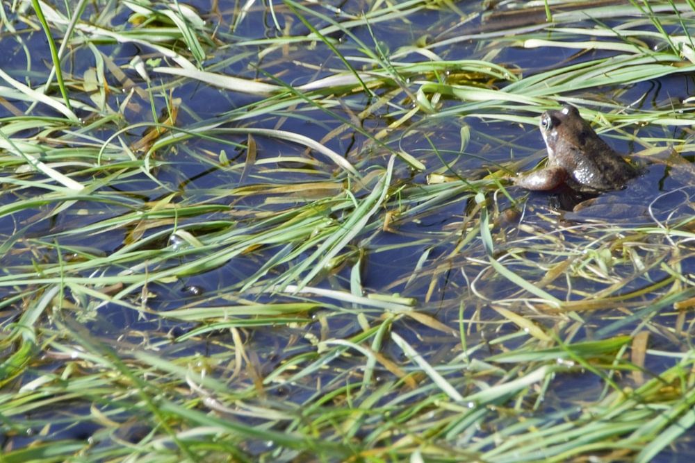 Auf den ersten Blick zeigt das Foto Gras und Wasser, aber wenn man genau hinsieht, erkennt man einen Frosch. Seine Beine sind deutlich unter Wasser zu sehen und sein Kopf schaut aus dem Wasser.