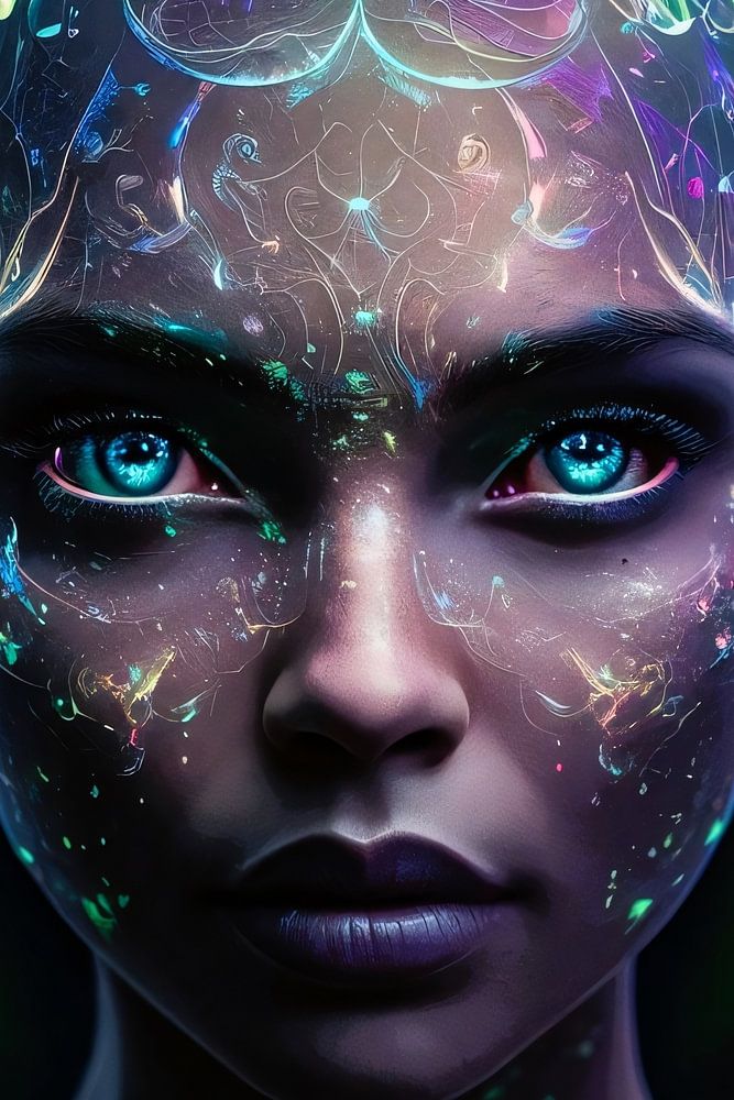 Dieses einzigartige Kunstwerk zeigt eine biolumineszente Frau, die in futuristischen Farben und Mustern strahlt. Ihre Augen glitzern mit intensiver Helligkeit und ihre Haut scheint in leuchtenden Neonfarben zu glühen. Dieses Design ist perfekt für alle, die moderne und futuristische Kunst lieben, und es bringt ein Gefühl von Geheimnis und Innovation in jeden Raum. Es ist ideal für Büros, Schlafzimmer oder jeden anderen Ort, der einen Hauch von Farbe und Modernität braucht. Lassen Sie sich von der verblüffenden Verschmelzung von Technologie und menschlicher Schönheit in diesem atemberaubenden Kunstwerk inspirieren.