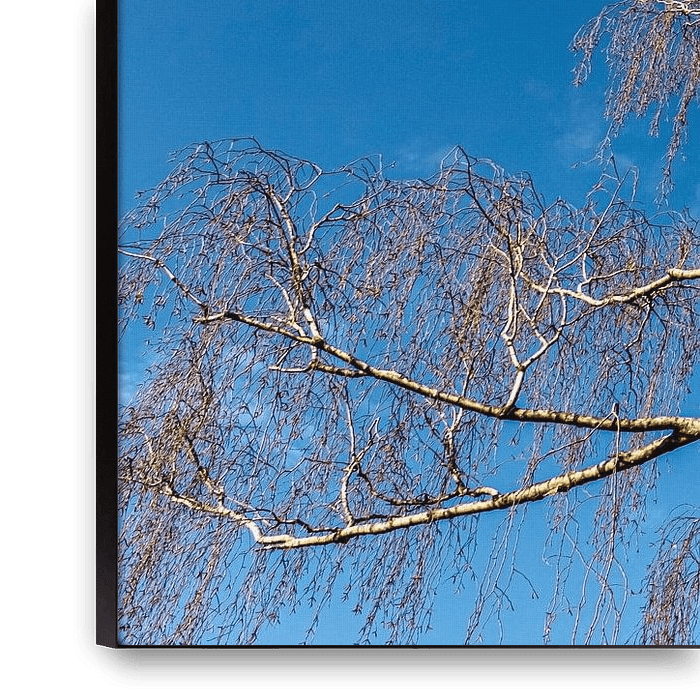 Birke mit ausgebreiteten kahlen Ästen im Winter vor blauem Himmel