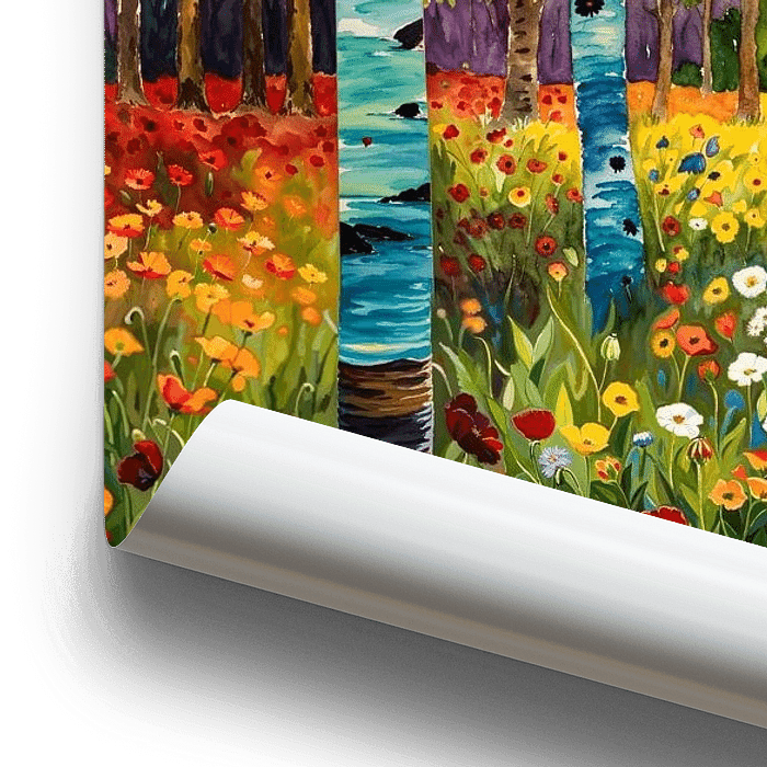 "Birken und Blumen" ist ein lebhaftes und farbenfrohes Gemälde, das die Pracht eines Birkenwaldes mit einer Fülle von Wildblumen kombiniert. Dieses Werk fängt die Essenz einer ruhigen, natürlichen Umgebung ein, in der die weißen Stämme der Birken elegant mit dem explosiven Farbspektrum der blühenden Blumen kontrastieren.