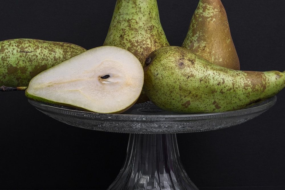Birnen in einem Hell-Dunkel-Licht. Ein Stillleben für die Küche oder das Innere des Esszimmers oder eines Restaurants.