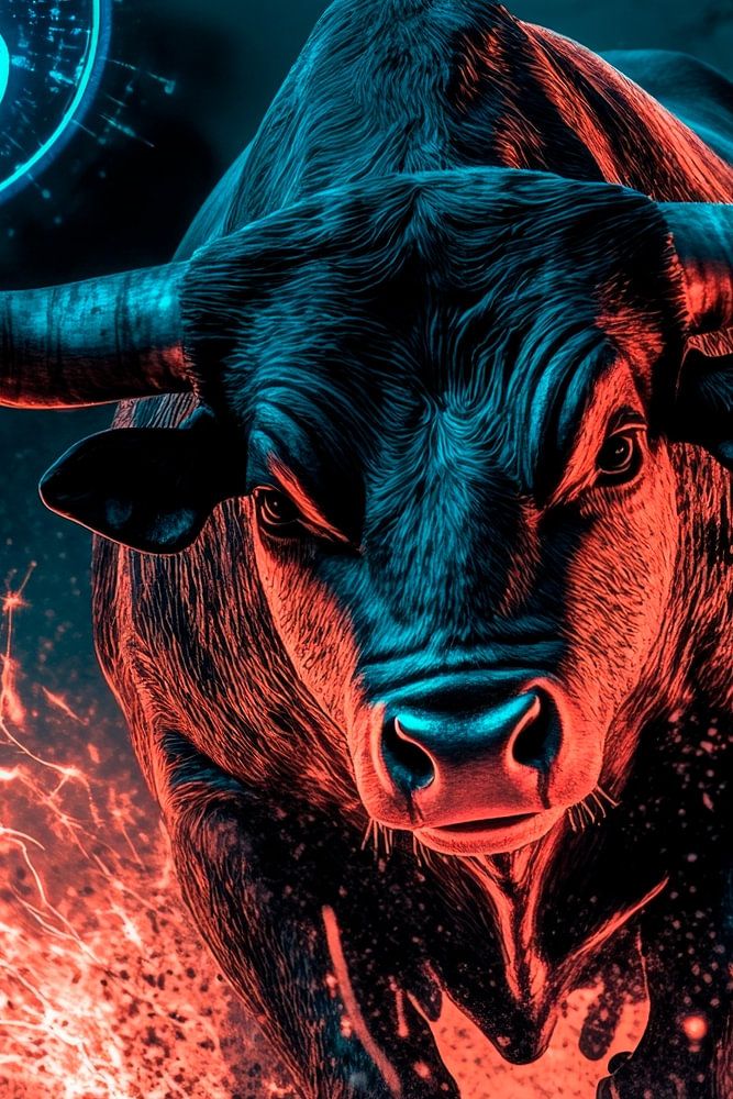 In einer dynamischen Nachtlandschaft stampft ein kraftvoller, leuchtend blauer Bulle durch funkelnde Funken, während das symbolische Bitcoin-Logo schillernd hervorsticht. Dieses fesselnde Bild strahlt Energie und Entschlossenheit aus, perfekt für ein Büro oder einen kreativen Arbeitsraum, um Innovationsgeist und finanzielle Ambitionen zu inspirieren.