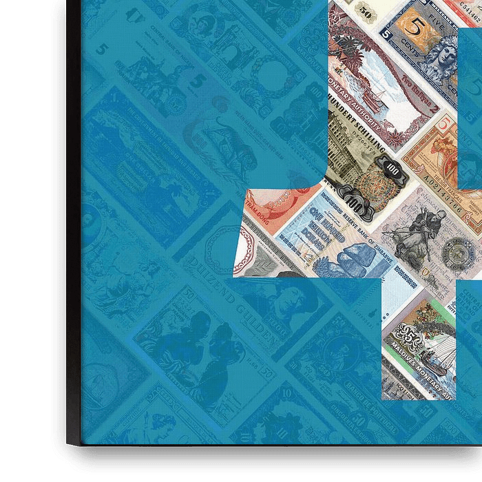 Bestelle dieses abstrakte Wandbild "Bitcoin over bills" (in blau) - Bitcoin art - Logo hinter alten, aufgehängten Banknoten von Roger VDB als Reproduktion auf Leinwand, Alu-Dibond, als Poster, Fototapete oder Acrylglasbild.