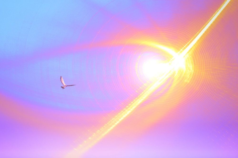 Ein Junge steht am Strand und ruft dem Vogel zu, er möge zurückkehren. Die Szene wird von der hellen Sonne und dem Strahlengang beleuchtet, der ein warmes Licht über das Wasser und den Sand wirft. Die leuchtenden Farben des Himmels und des Meeres, zusammen mit den violetten Farbtönen im Bild, schaffen eine heitere und malerische Umgebung. Die Gesamtkomposition erweckt ein Gefühl von Freiheit am Meer.