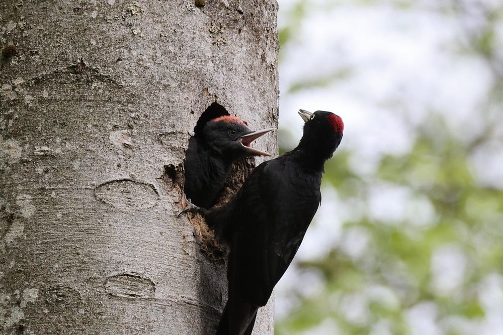 Black Woodpecker ( Dryocopus martius ) feeding young nestling, Swabian Alb Germany